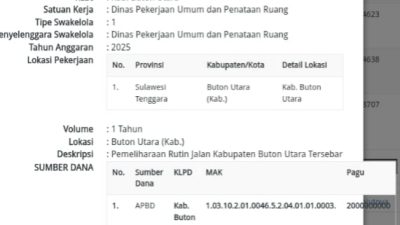 “Rehabilitasi bangunan pasar Mina-minanga blok B, dengan nomor tender 3372623 yang dimenangkan oleh CV. Jatiraya Perkasa, Jalan KH. Ahmad Dahlan nomor 9-Kendari (Kota) Sulawesi Tenggara dengan NPWP 95.937.147.7-811 harga kontrak sebesar Rp. 1. 128.000.000,00 telah mengalami kerusakan gedung”, bebernya.