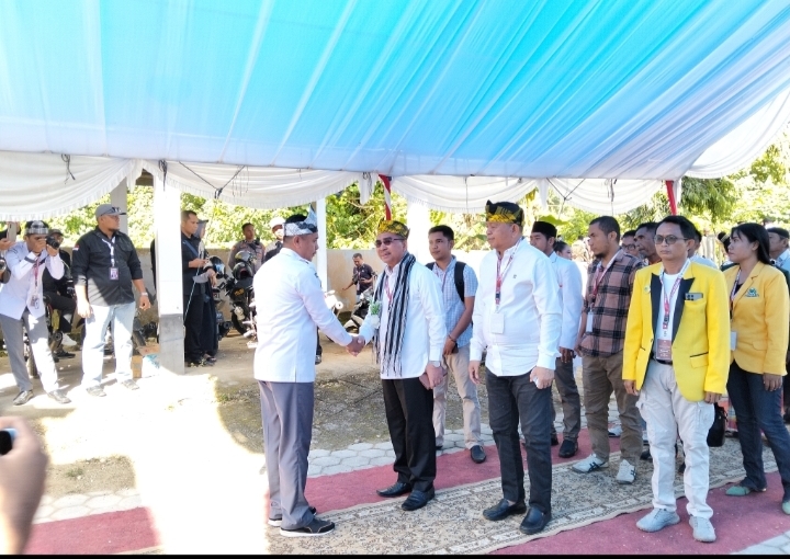 Keduanya tampak mengenakan kemeja putih yang sederhana namun penuh makna, dengan tambahan ikat kepala tradisional Kampurui, simbol identitas budaya yang menunjukkan rasa hormat terhadap tradisi lokal.