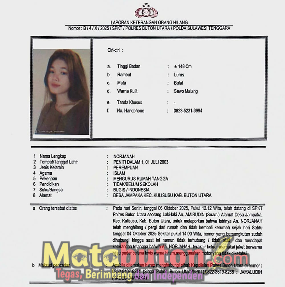 BURANGA, Matabuton.com-Seorang perempuan bernama Norjanah (22), warga Desa Jampaka, Kecamatan Kulisusu, Kabupaten Buton Utara, dilaporkan menghilang sejak Sabtu, 4 Oktober 2025 sekitar pukul 14.00 WITA.