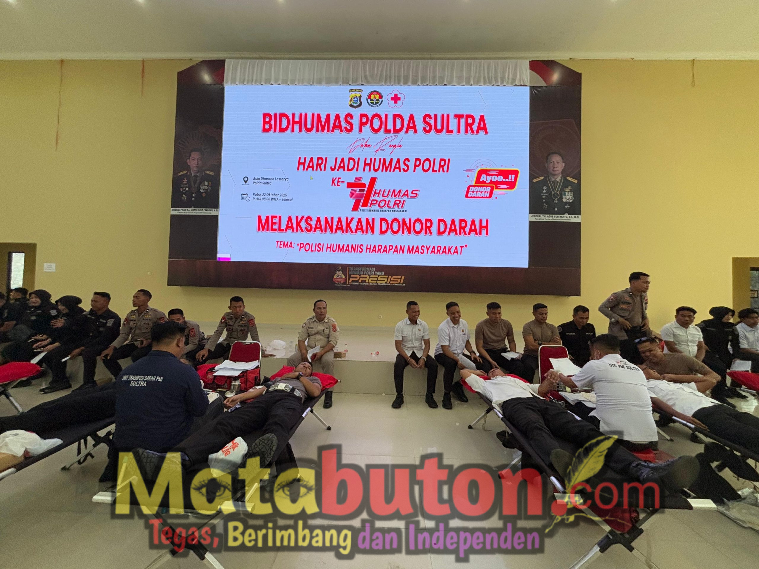 KENDARI, Matabuton.com-Dalam rangka memperingati Hari Ulang Tahun (HUT) Humas Polri ke-74, Kepolisian Daerah Sulawesi Tenggara (Polda Sultra) sukses mengumpulkan 155 kantong darah melalui kegiatan donor darah serentak yang digelar di Aula Dharana Lastarya Polda Sultra.