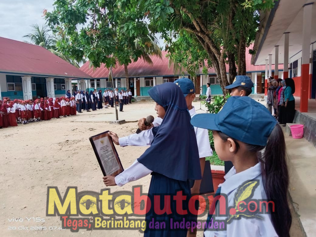 BURANGA, Matabuton.com-SMP Negeri 4 Kambowa bersama SD Negeri 1 Pongkowulu, Kecamatan Kambowa, Kabupaten Buton Utara (Butur), Sulawesi Tenggara, menggelar upacara peringatan Hari Sumpah Pemuda ke-97 di halaman SMPN 4 Kambowa, Selasa (28/10/2025).