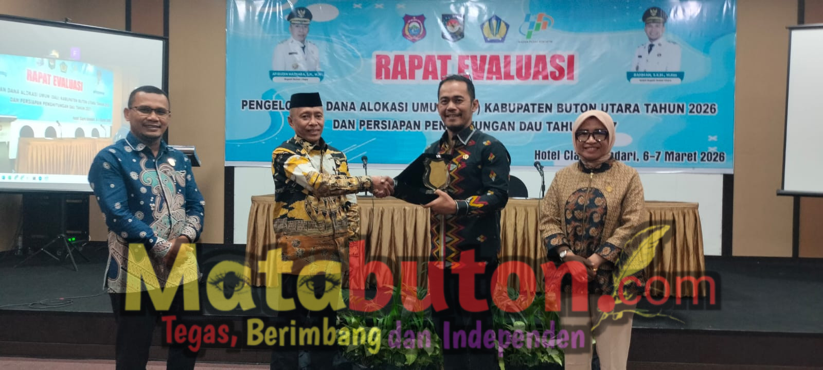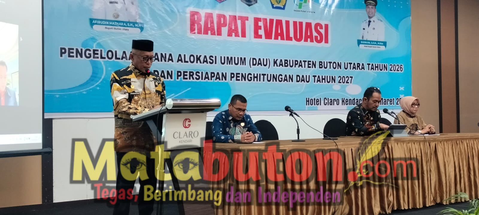 KENDARI, Matabuton.com-Bupati Buton Utara, Afirudin Mathara, resmi membuka rapat evaluasi pengelolaan Dana Alokasi Umum (DAU) Kabupaten Buton Utara tahun anggaran 2026 sekaligus persiapan penghitungan DAU tahun 2027.