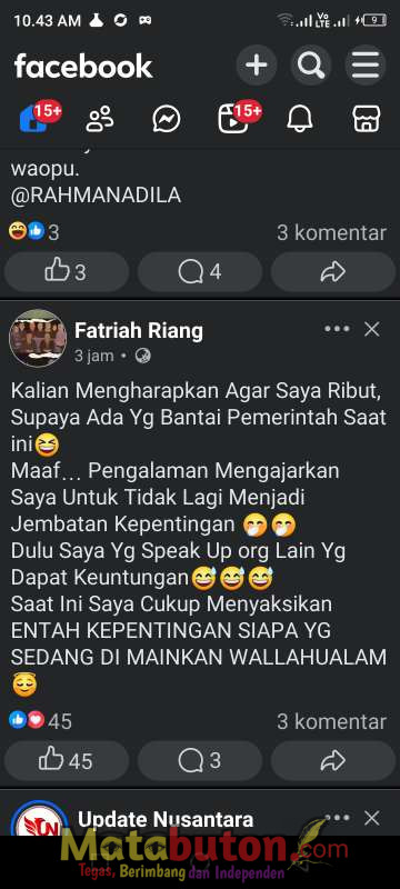 BURANGA,Matabuton.com-Unggahan di media sosial yang diduga ditulis Wakil Ketua II DPRD Kabupaten Buton Utara (Butur), Fatriah, menuai sorotan dari kalangan mahasiswa. Salah satunya datang dari Lecil Labanisi, mahasiswa Universitas Nahdlatul Ulama Sulawesi Tenggara.