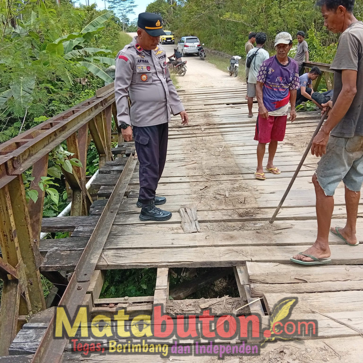 Dalam prosesnya, personel kepolisian bersama warga membenahi bagian jembatan yang rusak agar kembali layak dilalui.
